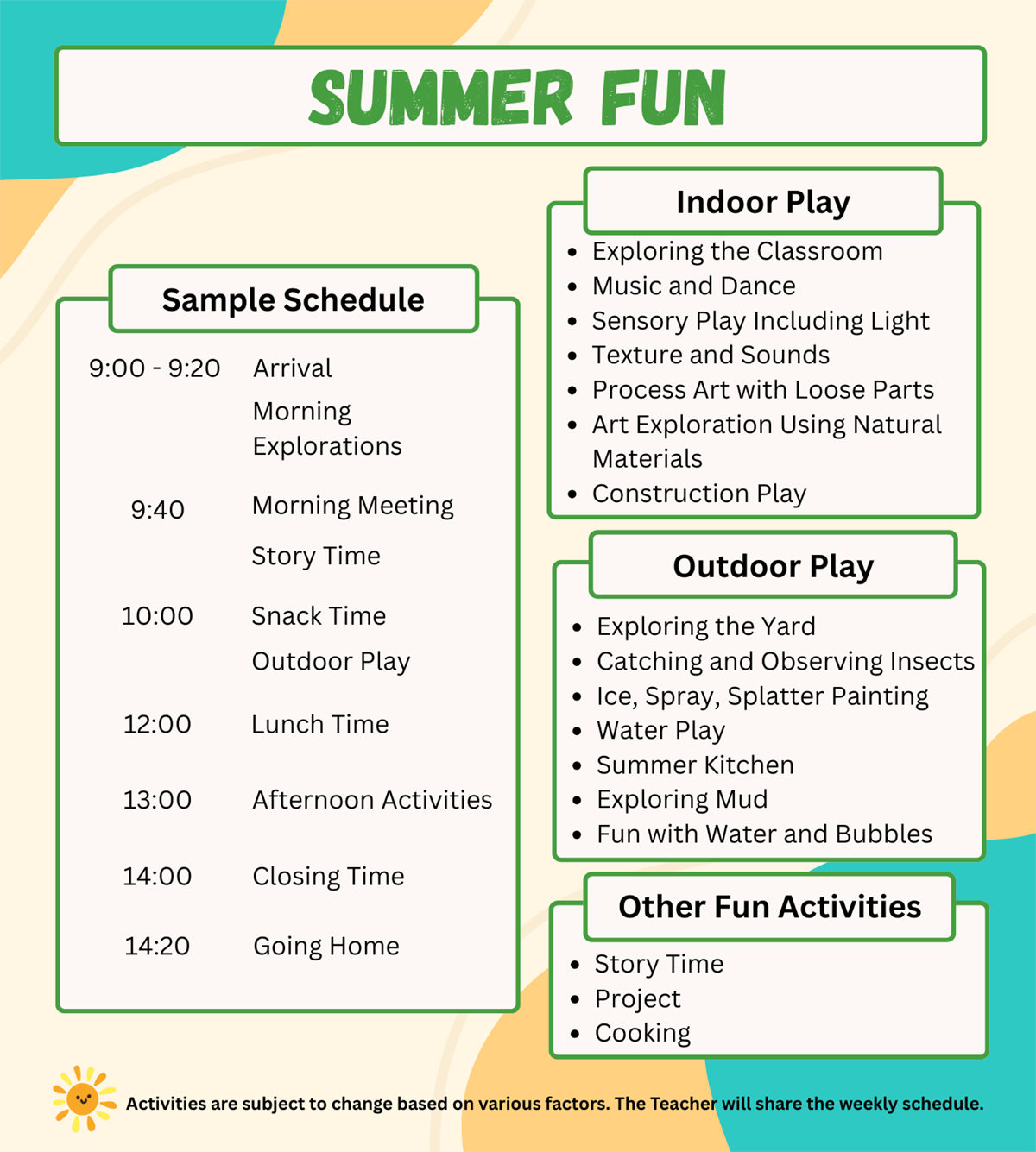 Enrollment in Summer Fun classes and services may be cancelled at any time before 12:00 noon on Friday, May 29, 2026; however, a 40% cancellation fee will be charged based on the tax-inclusive fees. The remaining balance will be refunded. No refunds will be issued for cancellations made after 12:00 noon on May 29, 2026.